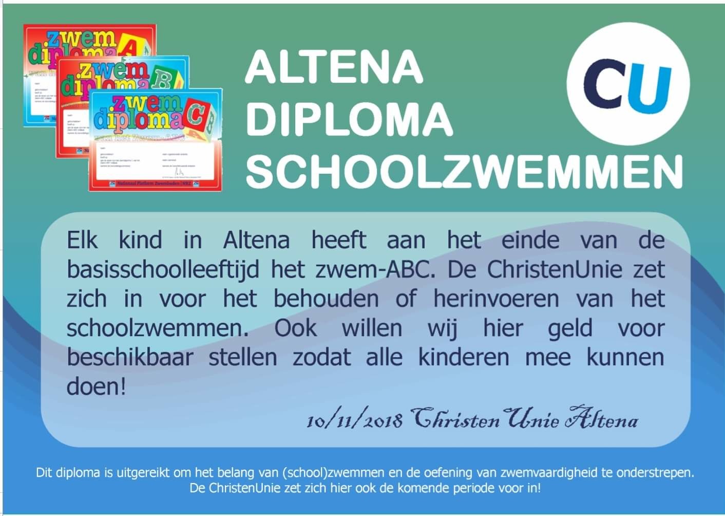 Elk kind in Altena heeft aan het einde van de basisschoolleeftijd het zwem-ABC. Dat is de onze inzet. Een zwemdiploma voor kinderen is heel belangrijk in ons waterrijke gebied. Wij willen daarom dat alle kinderen een zwemdiploma kunnen halen. Door een ‘zwemdiploma’ uit te reiken aan zwemdocenten willen wij dat op ludieke wijze onder de aandacht brengen.